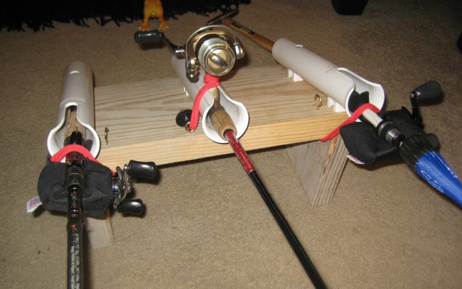Attach the cup hooks to the other side of the rod tube on the bottom side of the plank. The location will depend on the amount of stretch your bungee has to secure your rod. You can see in the pictures how I secure my baitcasters and spinning rods. I attach an additional cup hook on the top of the plank that works better to secure my spinning gear.