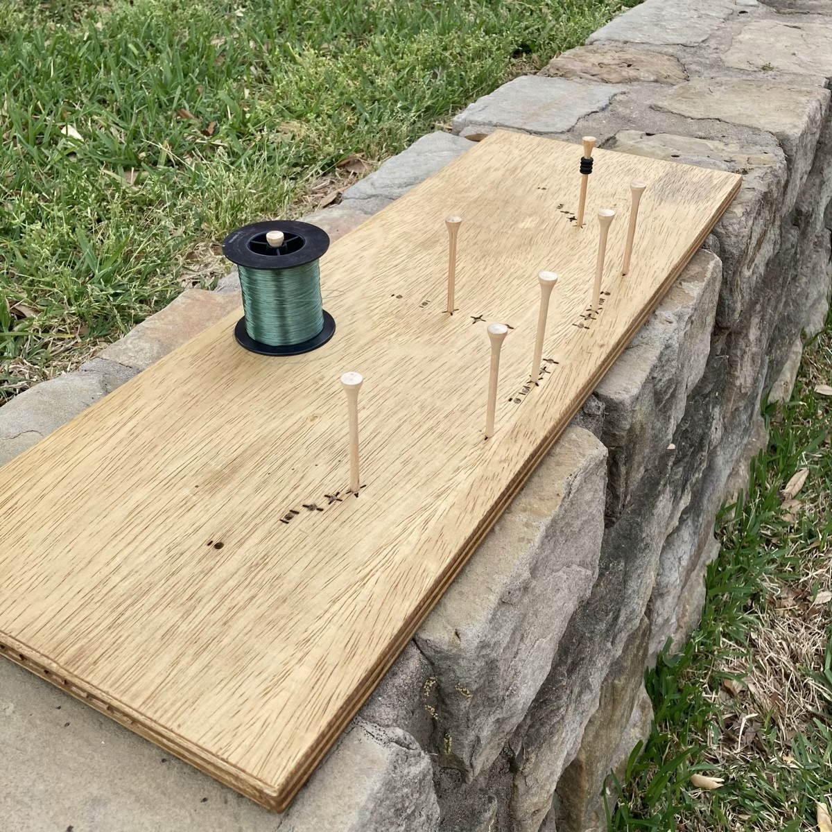 Pull the line from the spool and route it around the six perimeter T-pins. [00:02:37]