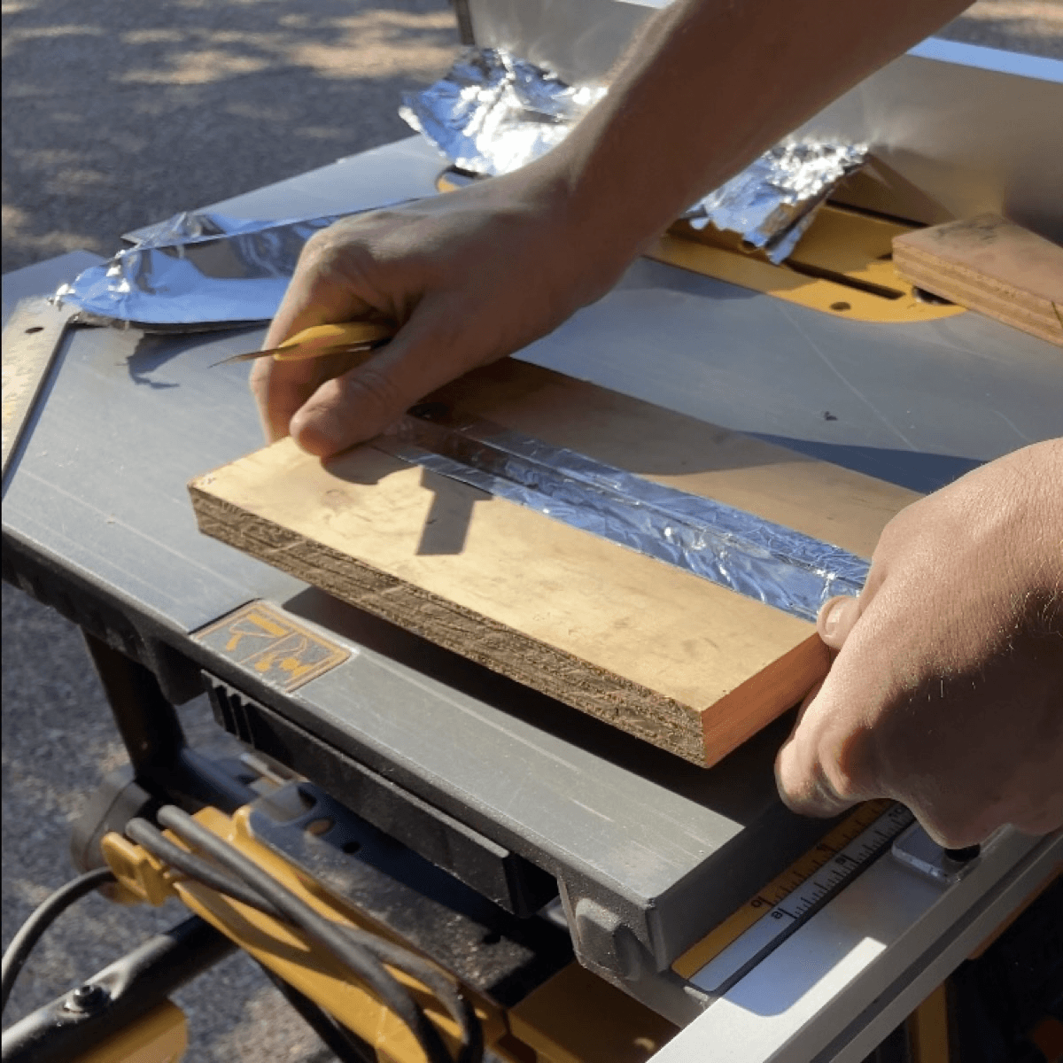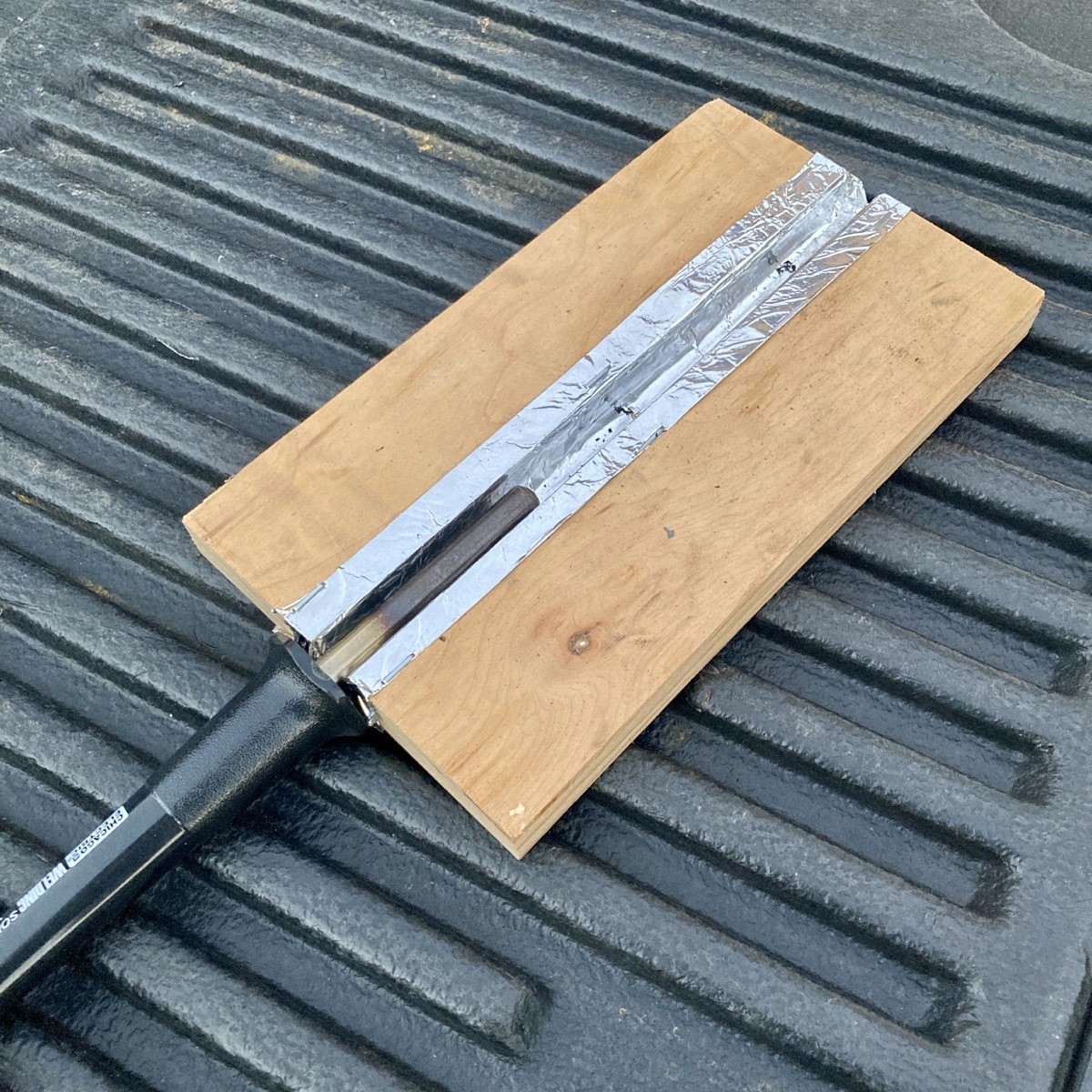 Press heavy duty aluminum foil into the groove of the plywood, working it smooth along the way. Using a staple gun, fasten tight along the top edge of the groove. Once fastened, run a carpet knife down a square to cut a straight edge.