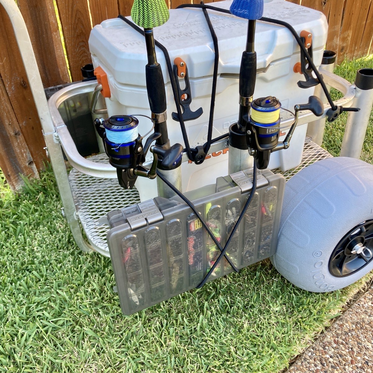 On my previous Trick Out An Aluminum Pull Cart for Fishing the Surf post, I received multiple questions on how I carry my tackle. Typically, I carry my tackle in a sling bag, but I’ve been doing some reorganizing for an upcoming trip, and I wanted to build some rigging onto the cart to carry the two UV-resistant Plano 3700 boxes I’m using.