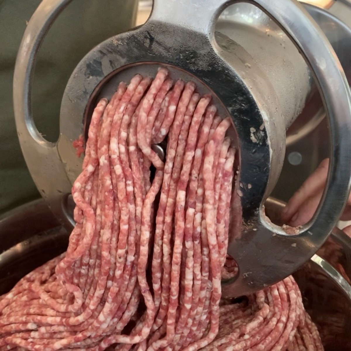 Fine Grind: Return the meat to the freezer for a few minutes, then switch to a fine grinding plate and run it through a second time. [00:03:26]