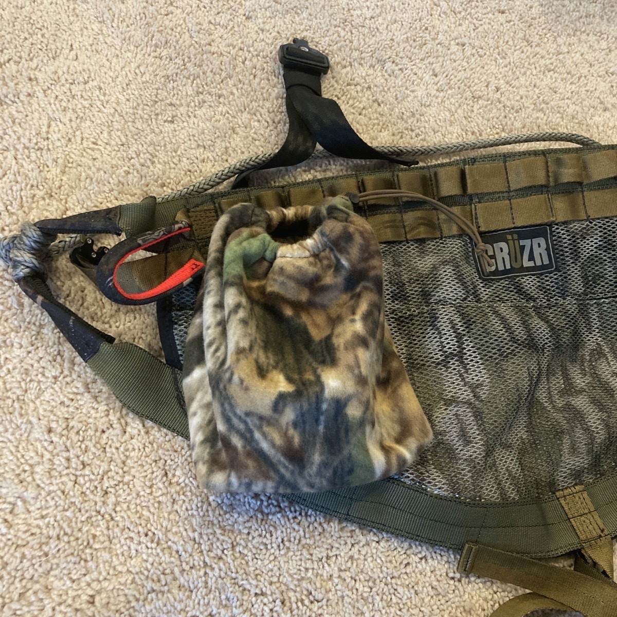 After seeing a post on saddlehunter.com from the user "Scale," I was inspired to make my own fleece dump pouch for my hunting saddle. Fleece is a great material for this because it’s quiet in the woods and has just enough stretch. I’ve modified the attachment method to use tri-bar slides rather than snaps, which I find stays more secure on the molle webbing.