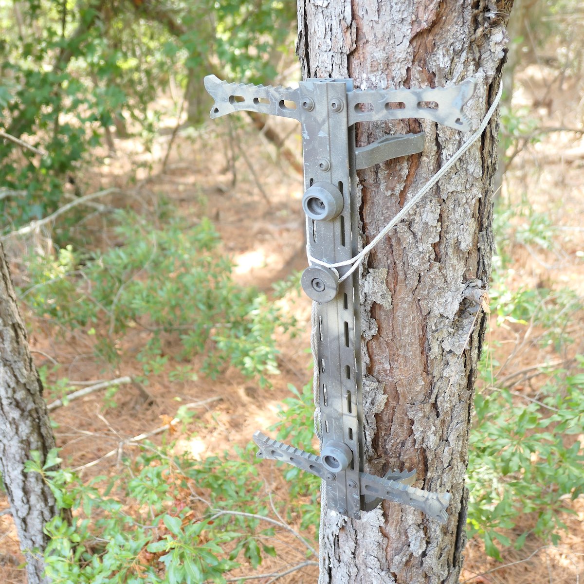 There are multiple ways to attach your climbing sticks to the tree while saddle hunting. One of the easiest and lightest weight is to tie a daisy chain.
