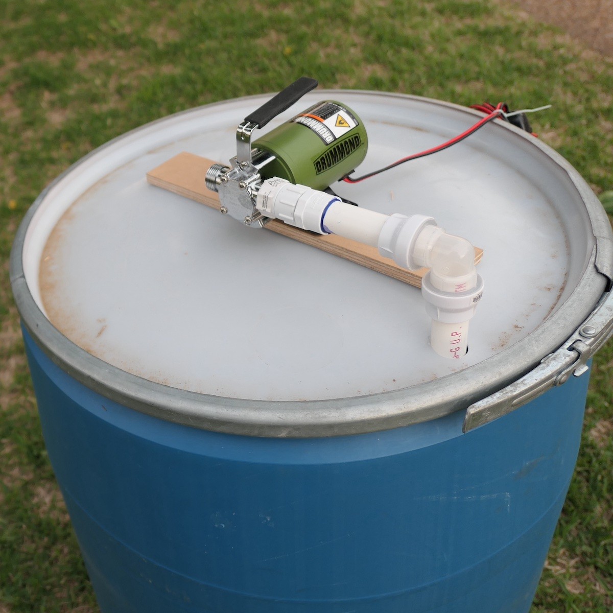 Cut the other end of the PVC at a 45 degree angle to prevent it from suctioning to the bottom of the barrel. [01:25]